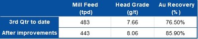 The mill throughput was reduced from 544 tpd in July to 449 tpd in September in order to increase the leach retention time