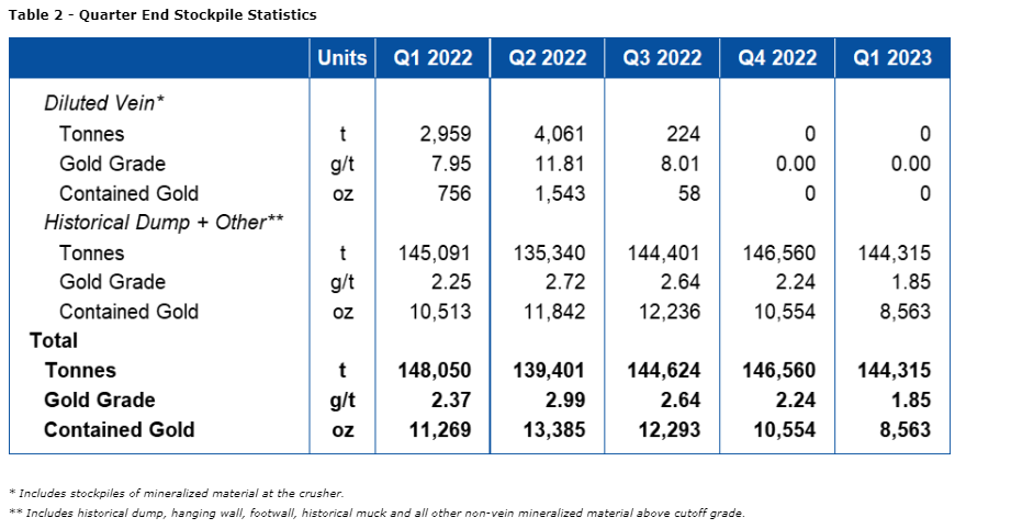 The mine averaged 588 tpd of diluted vein and historical dump plus other material in Q1 2023 with a strip ratio of 36.3 which included accelerated waste development of the phase 3 in West pit. The current stockpile is 144,315 tonnes containing 8,563 oz Au at 1.85 g/t Au.