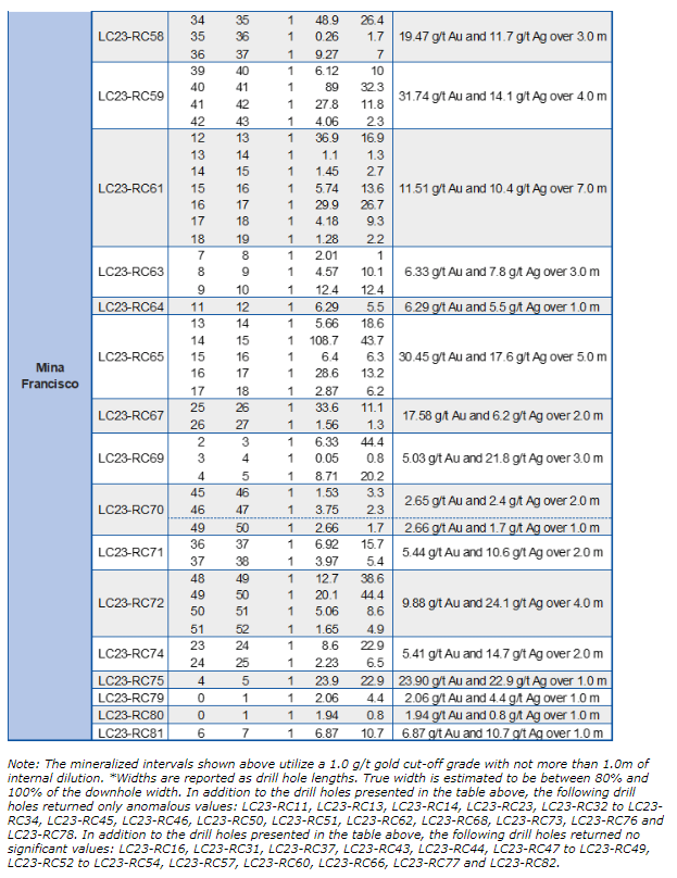 At the Mina Francisco area, several drill holes were designed to intersect the down-dip extension of a high-grade block previously identified in the 2022 drilling campaign. Drill hole LC23-RC65 intersected 30.45 g/t Au and 17.6 g/t Ag over five m (4.5 m ETW) and LC23-RC59 intersected 31.74 g/t Au and 14.1 g/t Ag over four m (3.3 m ETW), at 31 m and 75 m down dip, respectively, from the projected surface exposure, confirming the high-grade gold mineralization is open to the northwest.