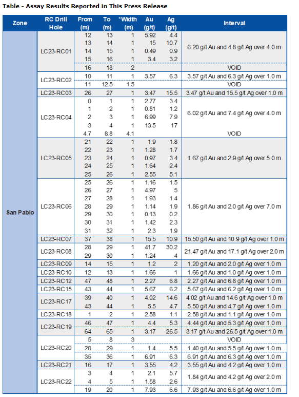 Drilling of the San Pablo area was also intended to improve the delineation of the shallow vein geometry. Results from drilling are consistent with expectations. An angled drill hole, LC22-RC08, intersected an interval of 21.47 g/t Au and 17.1 g/t Ag over two m (ETW), 29 m vertically from surface. Vertical drill hole LC22-RC07, collared at the same drill pad, intersected 15.50 g/t Au and 10.9 g/t Ag over one m (0.9 m ETW), which confirmed significant down-dip continuity of 45 m from the surface exposure.