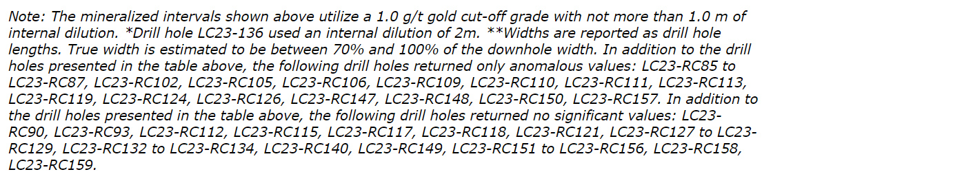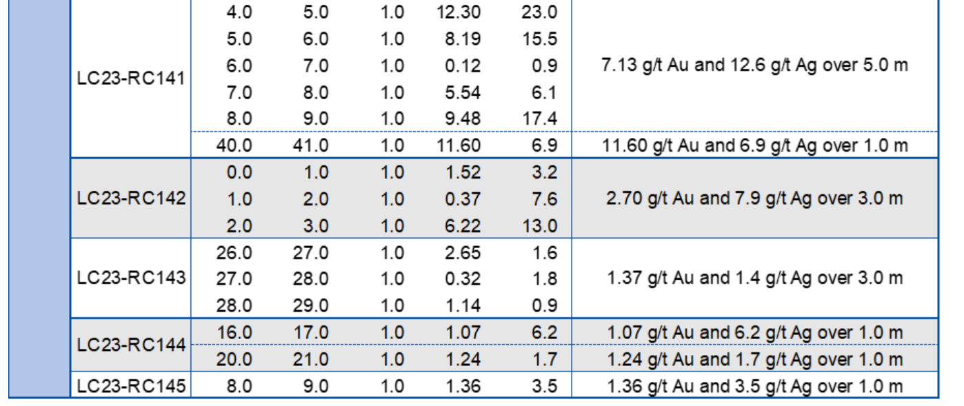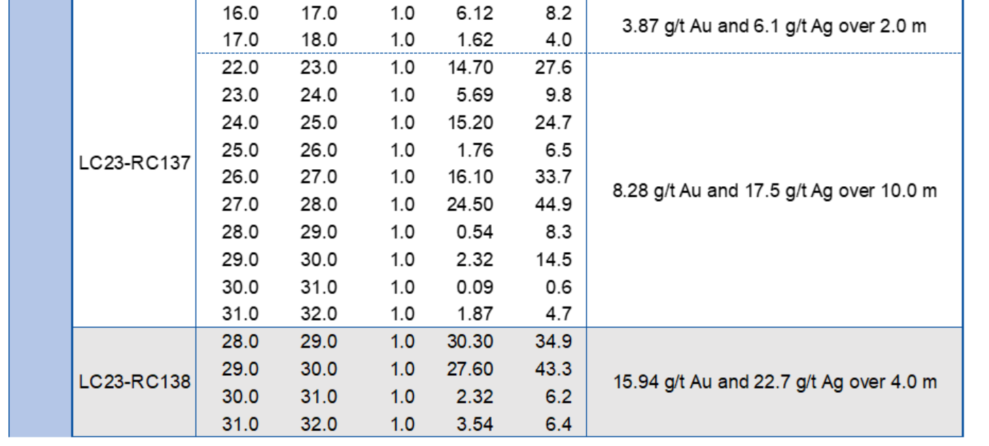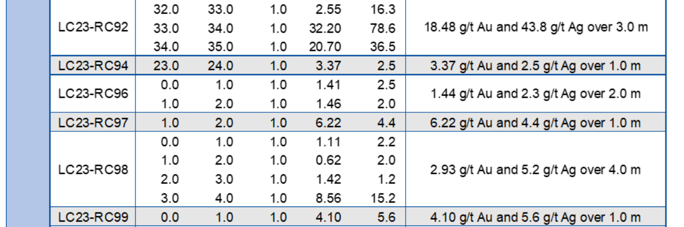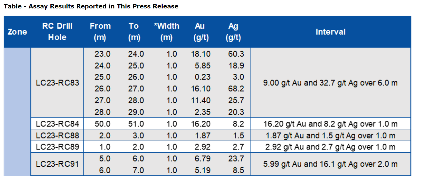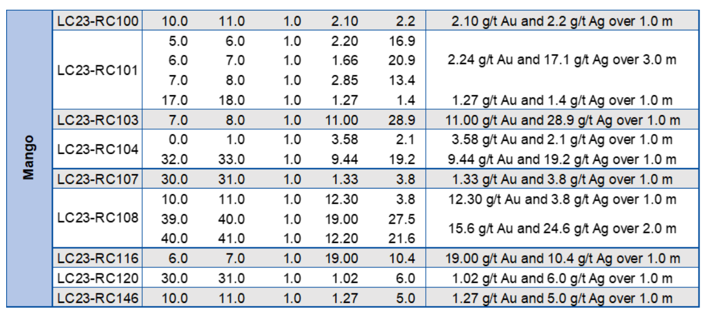 In the Mango area, drill hole LC23-RC108 intersected 15.6 g/t Au and 24.6 g/t Ag over 2.0 m (1.5 m ETW), targeting a high-grade zone intersected 28 m down dip of drill hole LC19-72, which encountered 36.55 g/t Au and 47.8 g/t Ag over 1.7 m (see press release dated May 21, 2019).