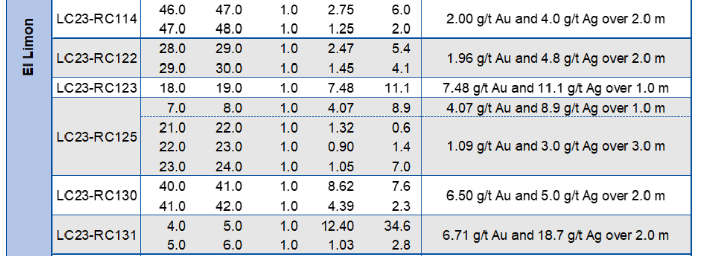 Drilling in the El Limon and Mango area was designed to improve the understanding of the vein geometry and to confirm mineralization trends identified in the previous drilling campaign. At El Limon, drill hole LC23-RC92 intersected 18.48 g/t Au and 43.8 g/t Ag over 3.0 m (2.6 m ETW), 15 m southwest (by strike) from hole LC19-70, which intersected 376.49 g/t Au over one m at 36 m from surface (see press release dated May 6, 2019).