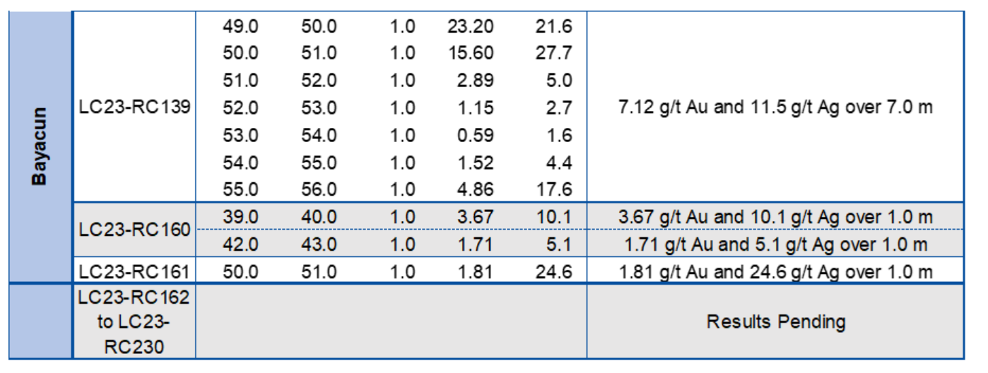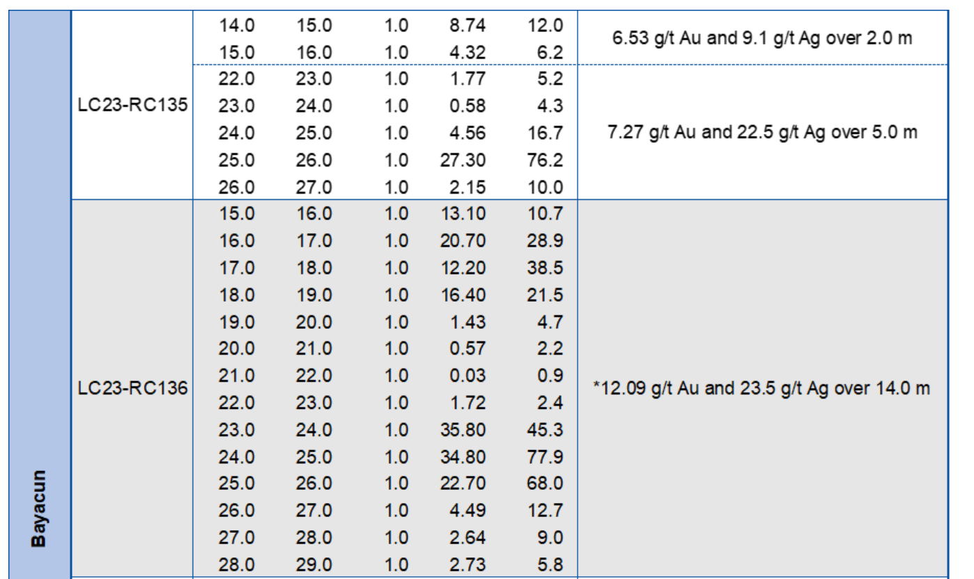 In the Bayacun area, several drill holes were designed to intersect and confirm a high-grade block previously identified in the 2019-to-2022 drilling campaign. Drill hole LC23-RC136 intersected a wide, shallow zone at 15 m from surface, which returned 12.09 g/t Au and 23.5 g/t Ag over 14.0 m (11.5 m ETW), including two high-grade intervals, 15.60 g/t Au and 24.9 g/t Ag over 4.0 m (3.5 m ETW) as well as 31.10 g/t Au and 63.7 g/t Ag over 3.0 m (2.3 m ETW), respectively. Previous diamond drilling in proximity to this drill hole intersected multiple high-grade and significantly wider-than-average intervals, including LC20-277, which intersected 22.26 g/t Au and 44.6 g/t Ag over 4.3 m ETW within a wider mineralized zone of 16.1 m ETW (see press release dated Aug. 31, 2020).