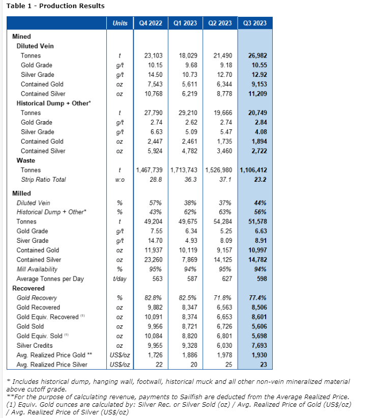 The mine averaged 519 tpd of diluted vein and historical dump plus other material in Q3 2023 with a strip ratio of 23.2:1 which included prestripping of the Southwest pit and the commencement of the bulk sample at San Pablo and Mina Francisco. The current stockpile is 134,608 tonnes containing 10,389 oz Au at 2.40 g/t Au.