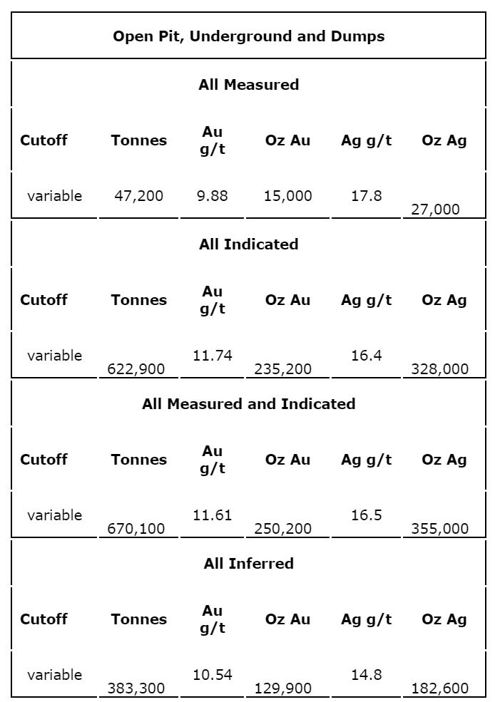 The San Albino Project open pit and underground mineral resource (see Figure 1 map below) includes a Measured and Indicated mineral resource of 670,100 tonnes at a diluted grade of 11.61 grams per tonne (g/t) Au for 250,200 gold ounces, and an Inferred mineral resource of 383,300 tonnes at a diluted grade of 10.54 g/t Au for 129,900 gold ounces (see table below). These mineral resources are constrained within two major and three smaller open pit shells at the Las Conchitas deposit, and four pit shells at the San Albino mine, two of which are currently in operation. The underground mineral resources are constrained by shells defined by stope optimizations.
