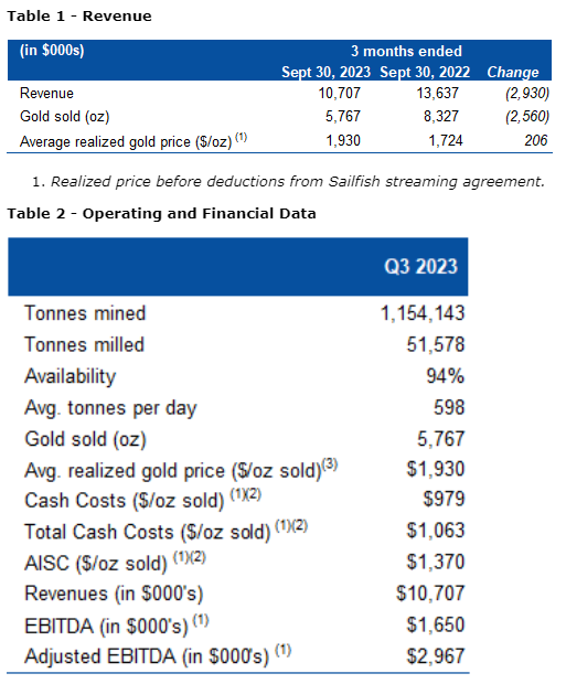 Akiba Leisman, Chief Executive Officer, states that "since August 14th, the mine and plant have been operating at or above designed levels. October marked the second month in a row of record gold ounces recovered, and 5,587 ounces of gold sold, which included the sales of finished gold held in inventory at quarter end due to a third-party refinery issue. This issue led to higher reported costs and lower reported Adjusted EBITDA and Mine OCF, but this effect will completely reverse in Q4. Q4 is shaping up to be a record for gold ounces recovered, gold ounces sold, Adjusted EBITDA, Mine OCF and Net Income, with record low Cash Costs, Total Cash Costs and AISC. The cash flow coming from the mine is enabling us to invest in exploration and rapidly repay debt, while we aggressively repurchase shares through our newly instituted NCIB."
