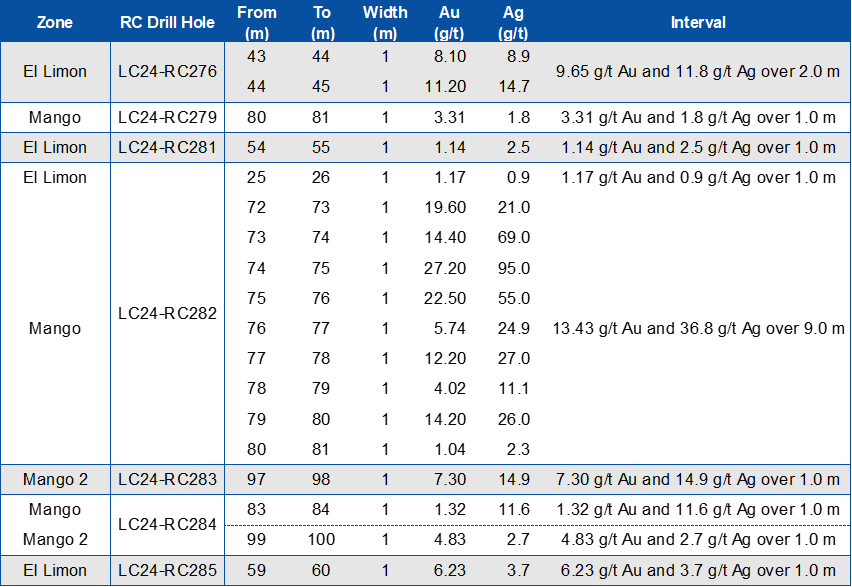 At the El Limon zone, drill hole LC24-RC276 intersected at 42.0 metres vertical depth, the 2.0-metre-wide (estimated true width) interval containing 9.65 grams per tonne gold and 11.8 grams per tonne silver, confirming a 31-metre southwest strike extension of high-grade mineralization, intersected by drill hole LC22-467, which assayed 37.02 grams per tonne gold and 54.4 grams per tonne silver over 2.30 metres (2.0 metres estimated true width) at a vertical depth 52.0 metres (see press release dated July 28, 2022). Both drill holes intersected the zone outside of the current resource model and confirm potential resource expansion beyond the company's current MRE.