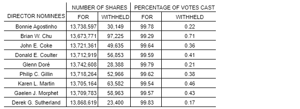 By a vote by ballot, the director nominees listed in the attached table were all elected as directors of the company to serve until the next annual meeting of shareholders of the company or until their resignations or their successors are elected or appointed.