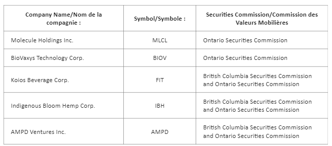 Effective immediately, the companies named in the attached table have been suspended pursuant to Canadian Securities Exchange Policy 3. The suspensions are considered regulatory halts as defined in National Instrument 23-101 trading rules. Cease trade orders have been issued by one or more securities commissions.