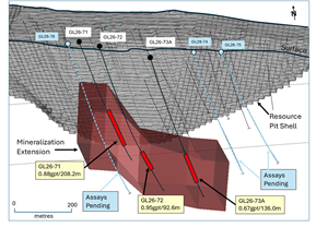 • MRE Update Underway: Drilling results to date have exceeded expectations. At the Golden Lake deposit (Figure 1) McFarlane has established continuity of mineralization stretching over 400 metres along strike with intercepts of gold mineralization ranging from 92 metres of 0.95 grams per tonne of gold (“g/t gold”) to 208 metres of 0.88 g/t gold (see Figure 2).   Engineering is actively updating geological modeling as part of a new Mineral Resource Estimate scheduled for release in June 2026.