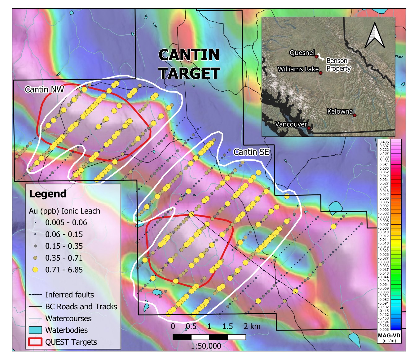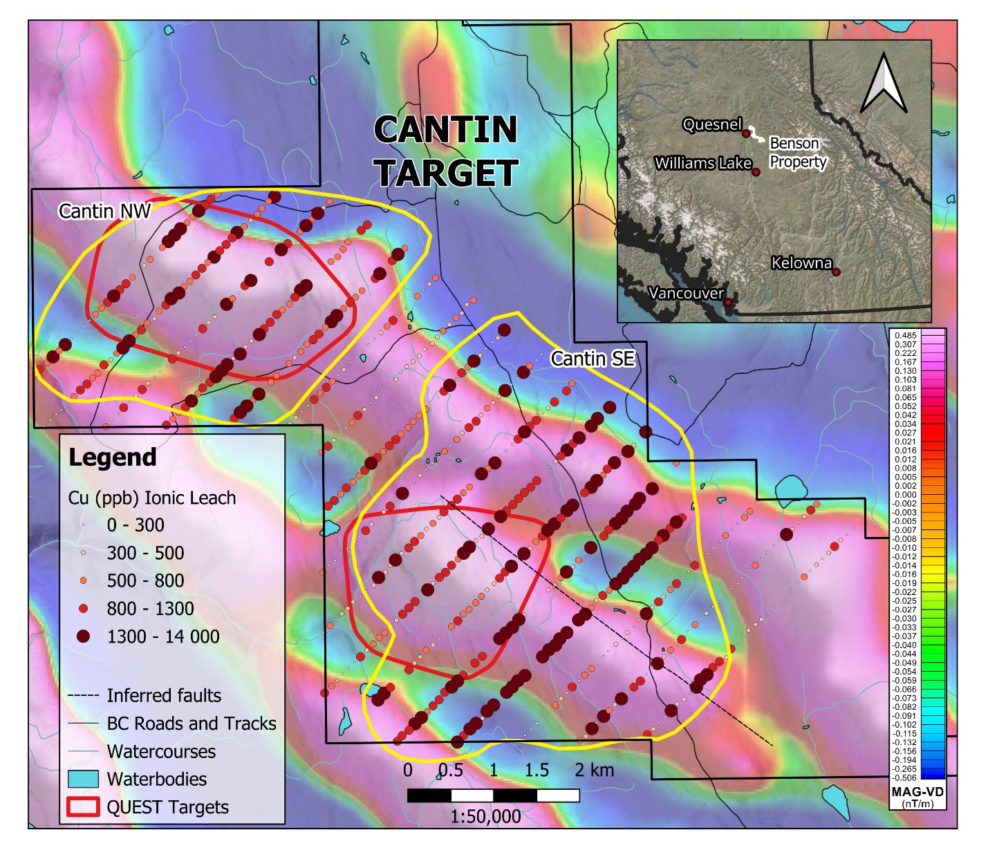 "The results from our 2-week follow-up sampling campaign at Cantin have expanded and refined our previously defined copper and gold anomalies which cover >23 km2 (combined) and remain open in several directions. We now see two discrete soil anomalies, each of which correlate with the QUEST Artificial-Intelligence targets which drew us to Benson in the first place," stated Rob L'Heureux, President & CEO of Metalero Mining. "And considering these Cantin anomalies represent less than 15% of the Benson Project area, we are excited to explore the other target areas while moving Cantin ahead to our maiden drill campaign."