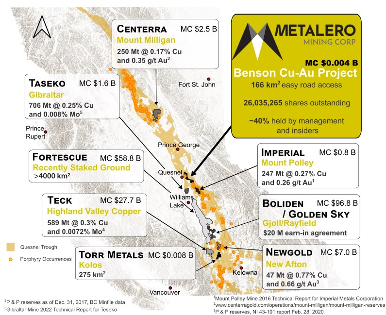 The Benson Project is strategically located in the Quesnel Trough, one of Canada's most important mineral belts. The Quesnel Trough is a Triassic/Jurassic-age belt of volcano-sedimentary and intrusive rocks which hosts >360 alkalic copper-gold porphyry occurrences and deposits. The >1,500 km long Quesnel Trough runs through the middle of BC stretching from the US to the Yukon Territory. It hosts several types of gold deposits and numerous major mines which produce copper and gold as well as variable amounts of silver.