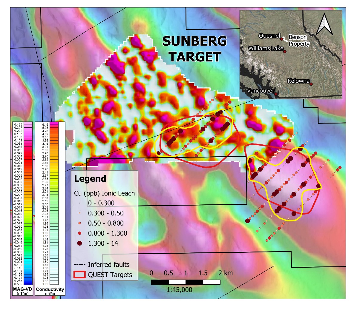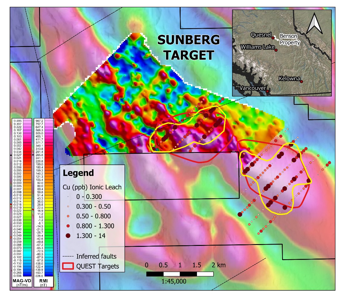 Figure 2. Ground and airborne magnetic survey results and copper-in-soil anomalies (yellow outlines) covering ~5 km2 at the Sundberg Target, Benson Project. These soil anomalies flank the magnetic highs and the AI-driven targets identified by Geoscience BC (QUEST), remaining open in several directions. The 1,300 ppb Cu limit represents the 80th percentile for all Ionic Leach sampling conducted by MLO at Benson to date (n=835).