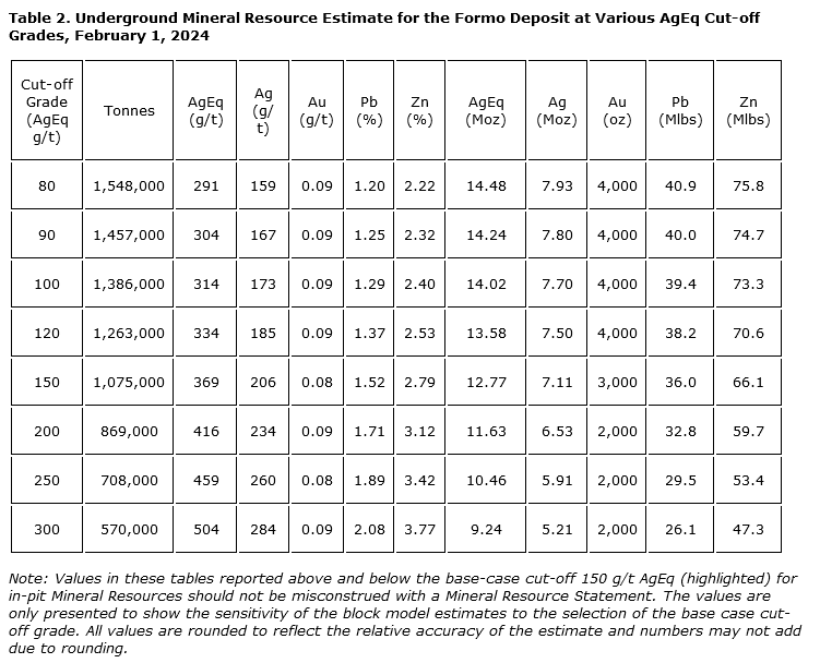 - It is envisioned that the Formo deposit may be mined using underground mining methods. Mineral Resources for Formo are reported at a base case cut-off grade of 150 g/t AgEq. The mineral resource grade blocks were quantified above the base case cut-off grade, below surface and within the constraining mineralized wireframes (considered mineable shapes).