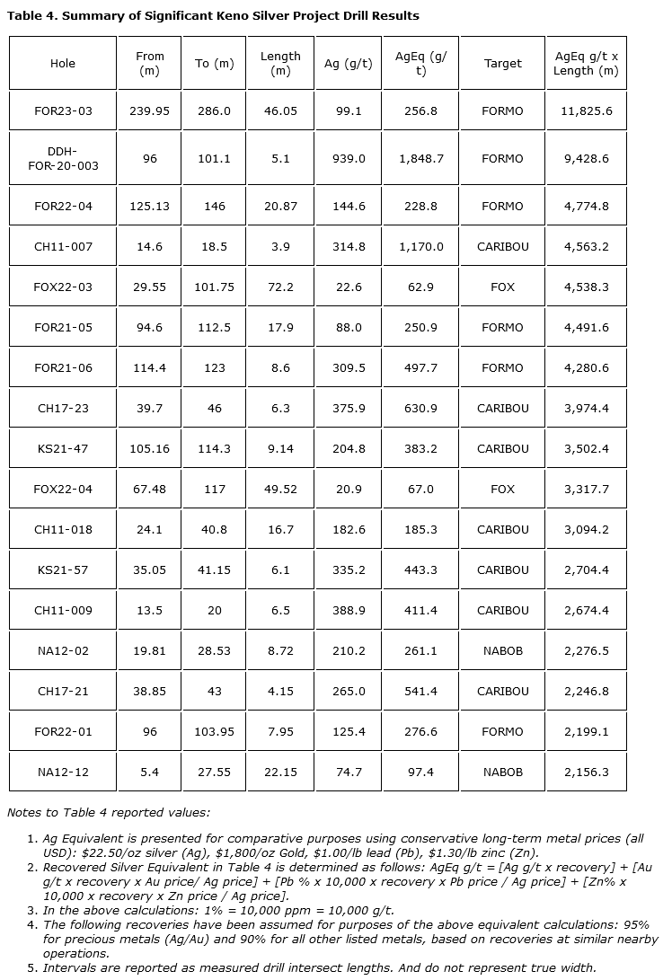 Underground Inferred Mineral Resources include the Formo deposit containing 12.77 Moz AgEq (7.11 Moz of silver, 3,000 oz of gold, 36.02 Mlbs of lead, and 66.14 Mlbs of zinc) within 1.08 Mt grading 369 g/t AgEq (206 g/t silver, 0.08 g/t gold, 1.52 per cent lead, and 2.79 per cent zinc). The Formo deposit is directly adjacent to the Silver Trail highway (Highway 11) and power lines that feed the central Keno Hill mill which is operated by Hecla, the largest primary silver producer in Canada and the USA. The Formo deposit directly adjoins Hecla's Keno Hill property, where Hecla is actively mining the nearby Bermingham deposit.In-Pit Inferred Mineral Resources include Caribou, Fox and Homestake and contain 5.40 Moz AgEq (2.70 Moz of silver, 5,500 oz of gold, 8.86 Mlbs of lead, and 32.95 Mlbs of zinc) within 1.46 Mt grading 115 g/t AgEq (58 g/t silver, 0.12 g/t gold, 0.28 per cent lead, and 1.02 per cent zinc). Bulk tonnage operations in the district include the historic open pit production from the Silver King, Hector Calumet, Onek and other deposits (currently held by Hecla) and feature significantly lower development and operating costs than more selective underground mining methods1.The 2024 Resource Estimate represents the equivalent of several years of production through the Keno area mill based on production guidance provided by Hecla which is planning to mine up to 4 million ounces of silver at Keno in 20242.Having identified the productive structures and defined this very significant mineral resource, the company expects to be able to add significant ounces during subsequent drill campaigns.The 2024 Resource Estimate was completed by SGS Geological Services ("SGS") based on 293 surface diamond core and reverse circulation drill holes totaling 17,654.6 meters.