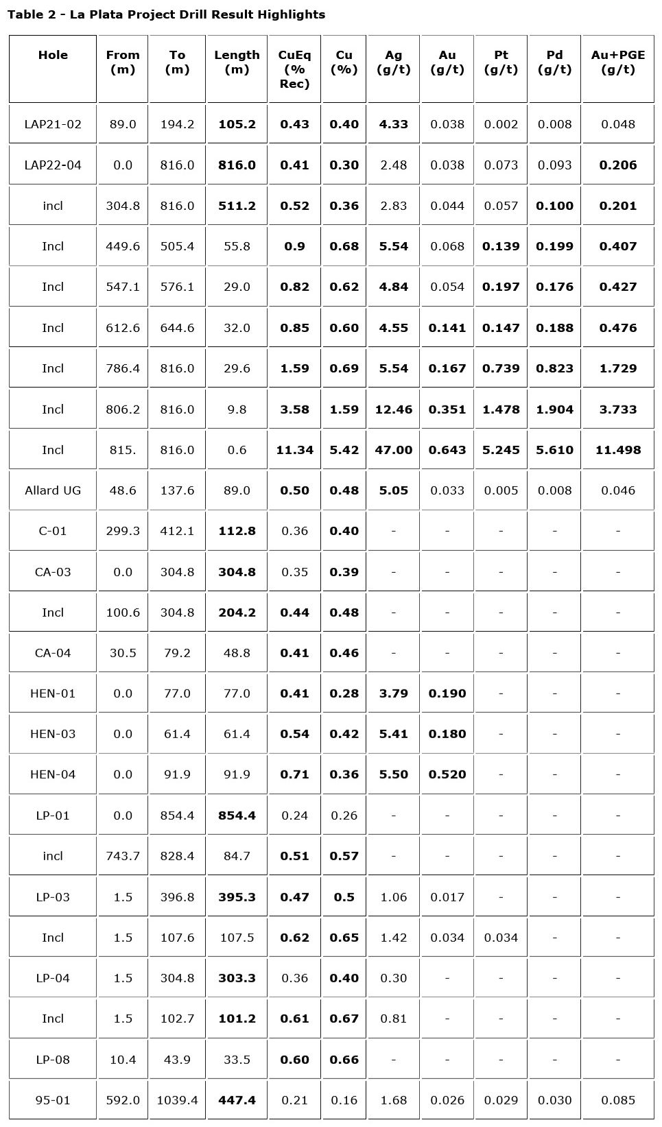 Broad zones of continuous mineralization over 500 m in width were intersected in three of the four drill holes with significant intervals exceeding 0.5% to 0.7% CuEq with associated Ag, Au, and PGEs. This is broadly consistent with the tenor of results from LAP22-04, which intersected 816 m of continuous mineralization, and historic hole C-01 which also intersected the same porphyry units (See Tables 1-2, Figures 1-3 above). La Plata drill holes 04, 05, 06 and 08 show four of the highest grade-thickness values in the Allard deposit to date ranging from 232 %-m to 334 %-m. These values place all four holes in the top 10 for copper drill hole results in the U.S. last year, as documented by www.juniormininghub.com.