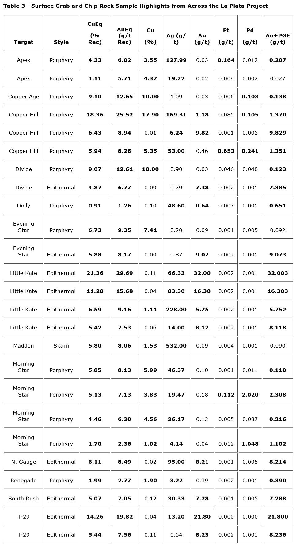 The La Plata project is centered on the alteration footprint of a 10 km2 precious metal-rich alkaline copper porphyry system that shows multiple centers of Cu-Ag-Au-PGE mineralization occurring over extensive areas as disseminated porphyry-style mineralization. Surrounding the central porphyry system is an associated high-grade silver and gold-rich epithermal system measuring at least 8 km by 12 km that hosts over 50 identified mineralized veins, replacement, and breccia structures. Historical production from some of these high-grade structures included bonanza grades for silver and gold.