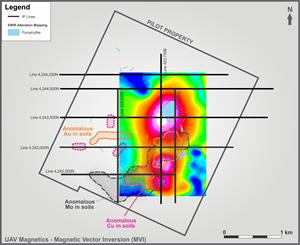 Recent work completed on the Pilot Project included additional surface geophysical induced polarization “IP” surveying. The first line in this survey identified a broad IP chargeability anomaly associated with low resistivity (high conductivity). Five east-west and three north-south lines have now been completed on the project. The chargeability anomaly remains open but at present has been traced over 1.25 kilometers along strike and is up to 2.2 kilometers wide. The IP anomaly is proximal to the high magnetic response feature identified in a previous drone-based magnetics survey conducted on the property. Alteration mapping in this area and previous soil sampling have confirmed a broad Cu-Au-Mo soil anomaly and the presence of widespread pyrophyllite, an alteration mineral often associated with the upper parts of porphyry copper deposits. A plan map showing the locations of the IP lines along with a chargeability pseudo section of Line 4,244,000N are attached. The Company has recently completed additional soil sampling and further IP survey lines are planned to explore the limits of this large anomaly in order to best design a potential first pass drill program.