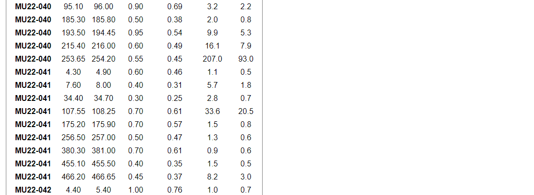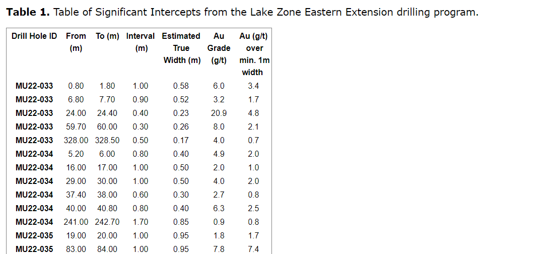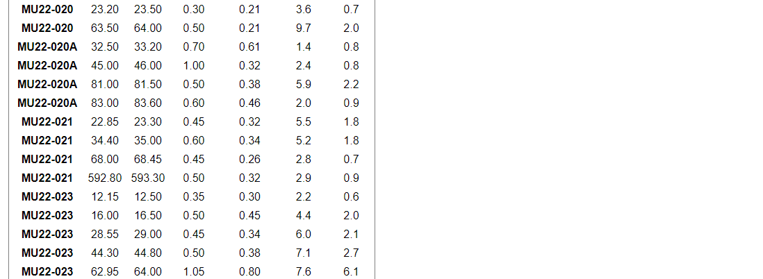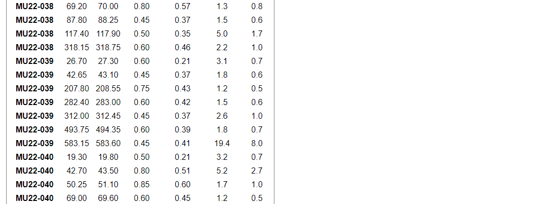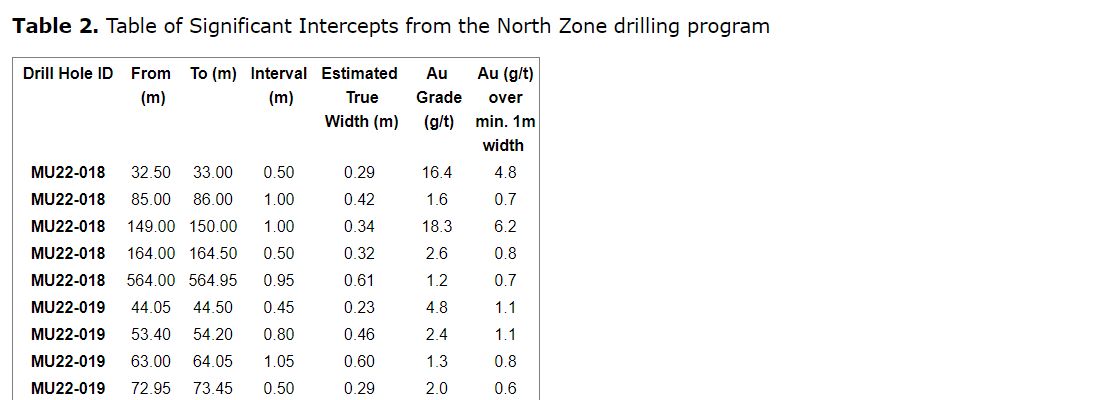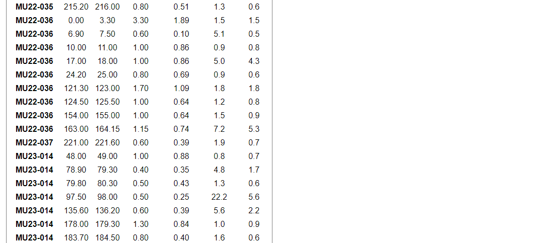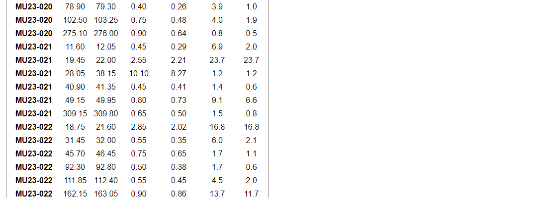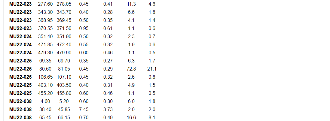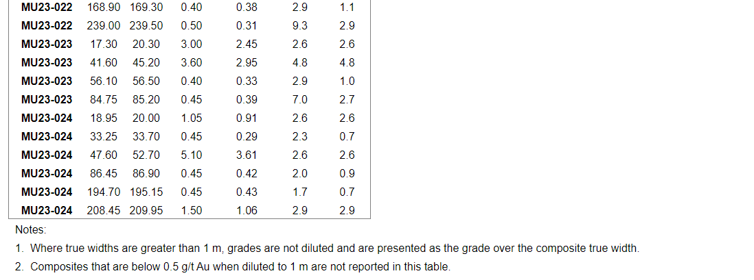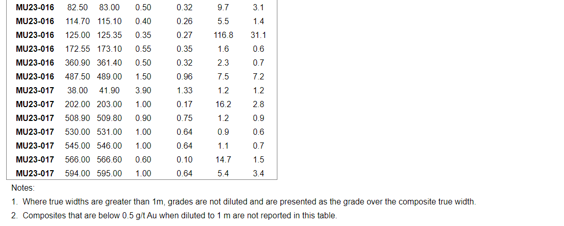 Other significant grades within the program include 51.3 g/t gold over 0.60 m (ETW of 0.52 m) and 88.6 g/t gold over 0.45 (ETW of 0.34 m) in MU23-015, as well as 116.8 g/t over 0.35 m (ETW of 0.27) in MU23-016.