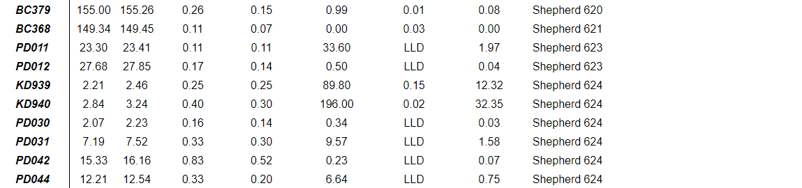 In addition to southern and depth extension potential of Shepherd, the drilling indicates a westward step of gold endowment across of the southern veins, corresponding with an apparent enrichment of stibnite relative to the bulk of Shepherd. This was evidenced by the progression from 600 to 620, and now initial intercepts into 630 indicate the progression continues. Future delineation of the westernmost veins provides an opportunity for further growth as the system remains open and untested to the west.