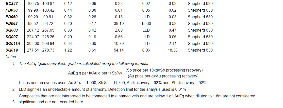 26.0 grams per tonne gold and 39.9 per cent antimony over 1.39 metres