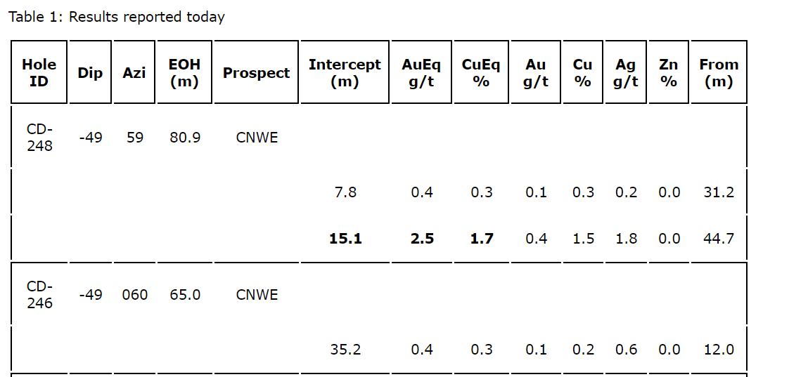 - CD-248 -- 15.1 m at 2.5 g/t AuEq (0.4 g/t Au, 1.5 per cent Cu and 1.8 g/t Ag) from 44.7 m;