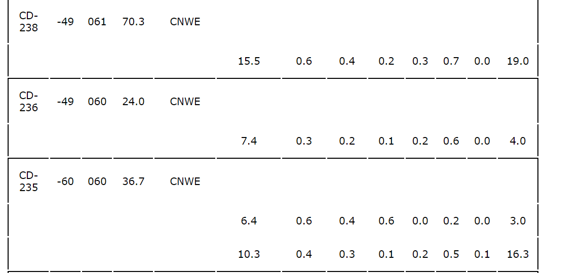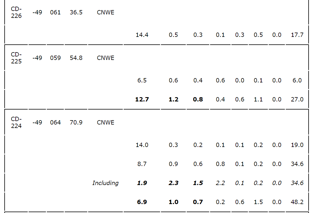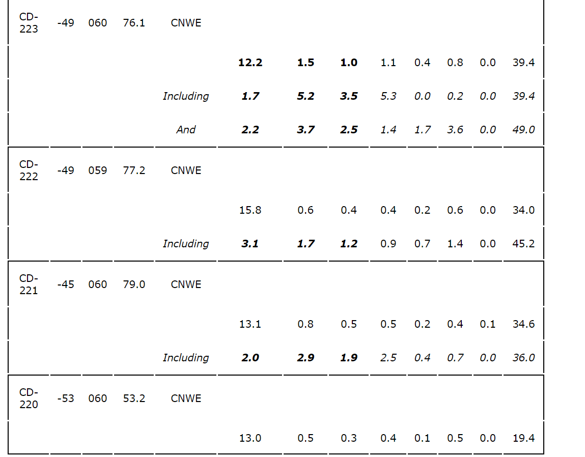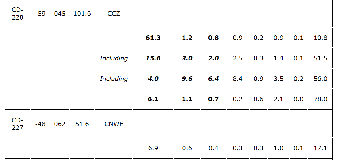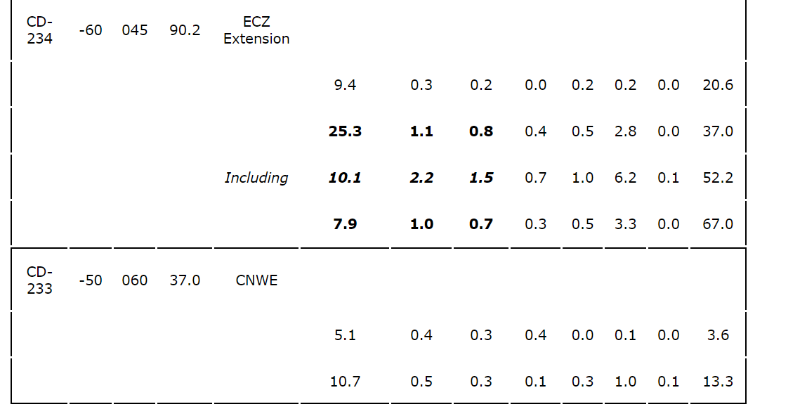 - Highest-grade gold zone defined 4.0 metres at 9.6 grams per tonne gold equivalent (CD-228) from 56.0 m: