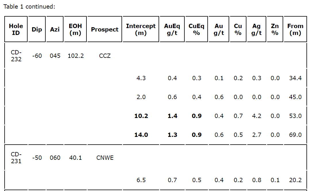 - CD-225 -- 12.7 m at 1.2 g/t AuEq (0.4 g/t Au, 0.6 per cent Cu and 1.1 g/t Ag) from 27.0 m.