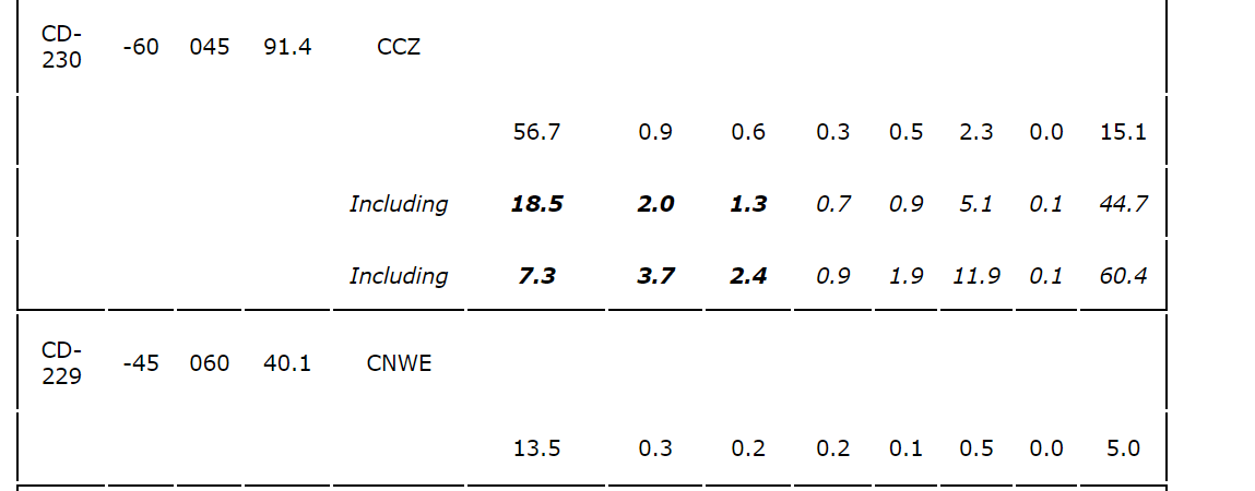 - 56.7 m at 0.9 g/t AuEq (CD-230) from 15.1 m, including:
