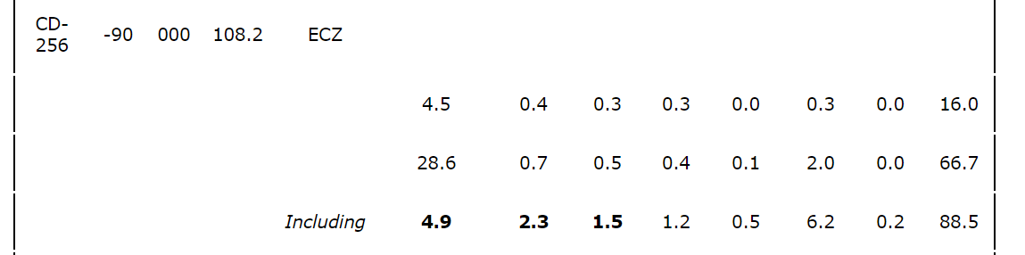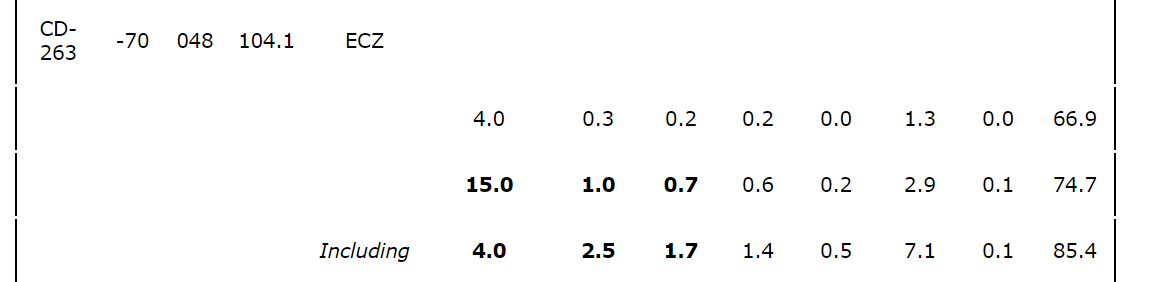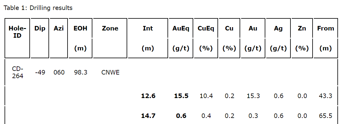 - CD-264 returned 12.6 m at 15.5 g/t AuEq (15.3 g/t Au, 0.2 per cent Cu and 0.6 g/t Ag) from 43.3 m.