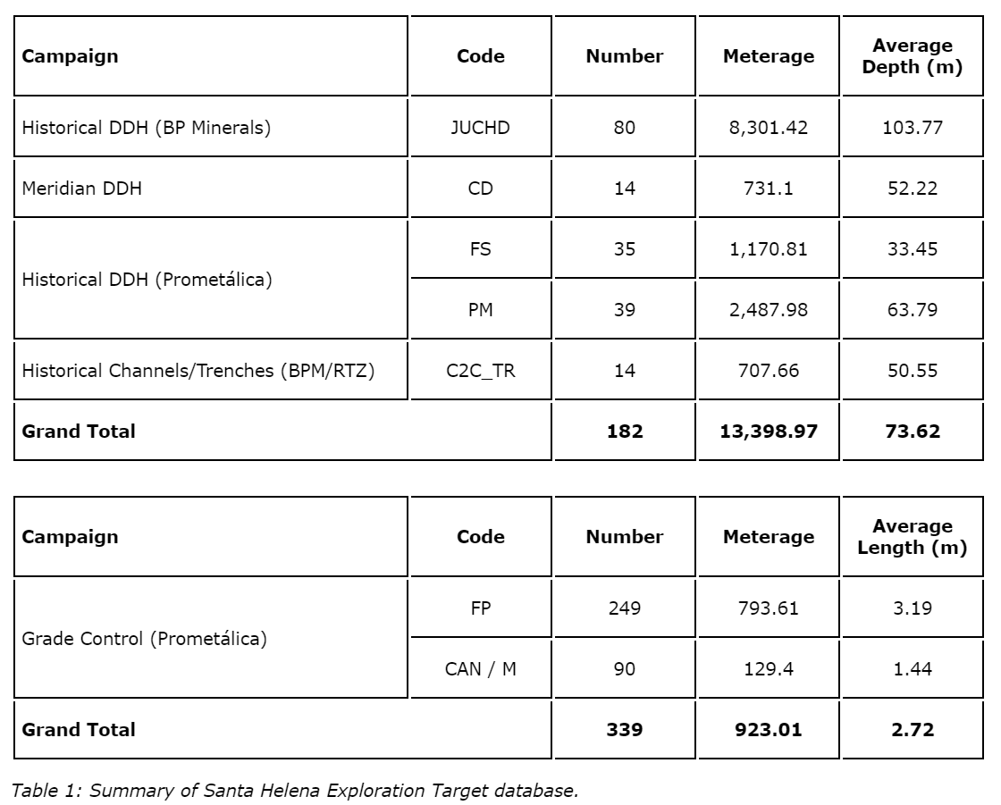 The Santa Helena database consists of data generated from multiple campaigns of surface and underground drilling and sampling, summarized as follows:
