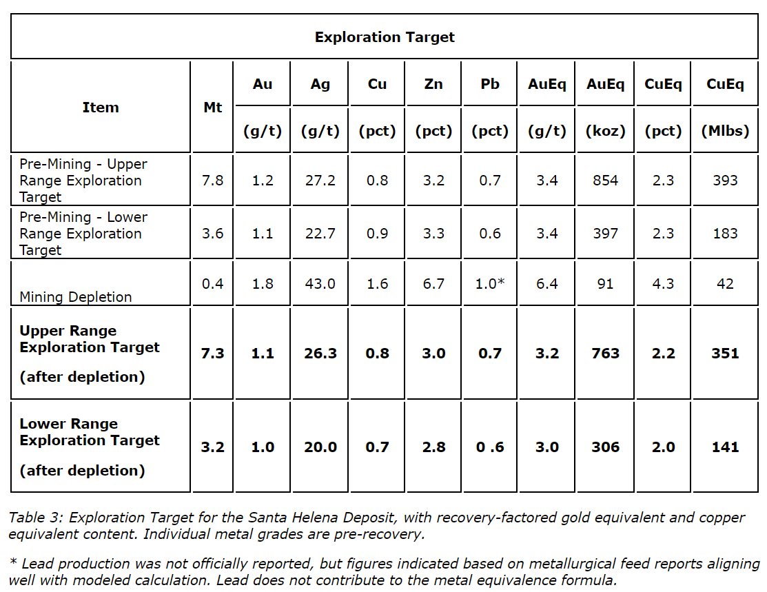 * The potential quantity and grade of an Exploration Target is conceptual in nature. There has been insufficient exploration to define a mineral resource, and it is uncertain if further exploration will result in the target being delineated as a mineral resource. The metal equivalence formula is based on the historical Santa Helena resource report 3 , calculated as AuEq based on gold being the dominant metal of the Cabacal VMS camp, as the expectation is that Santa Helena's mineralization will be evaluated for processing through a centralized facility at the Cabacal mill with the addition of a zinc circuit. True width is considered to be 80 to 90% of intersection width.