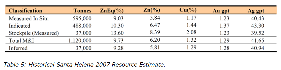 SRK was previously commissioned by the Cabacal Vendors to undertake a resource study on the Monte Cristo (Santa Helena) Zn Deposit in 2007 ("Table 5"). This estimate was last updated in a report dated 30 May 2007. The estimation procedure used three iterations of the inverse distance squared method on composited drillhole data with progressively longer search ranges. A Zn Equivalent % calculation was applied for reporting the estimates (ZnEq % = Zn% + (2.14 * Cu%) + (0.39 * Au ppm)+ (0.007* Ag_ppm); Metallurgical Recovery = 89% Zn, 89% Cu, 65% Au, 61% Ag; Au price USD 570 / oz; Ag price USD 11 / oz, Cu price USD 3.36/ lb; Zn price = 1.57 / lb). A qualified person has not done sufficient work to classify the historical estimate as current mineral resources or mineral reserves; and the issuer is not treating the historical estimate as current mineral resources or mineral reserves. The 2007 historical resource does not account for final depletion.