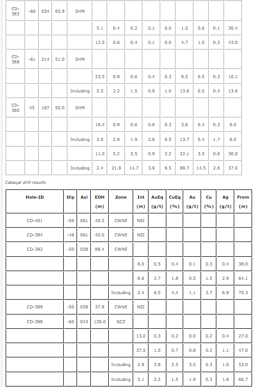 "The Cabacal mine area continues to deliver robust zones of copper-gold and silver mineralization from shallow depths. We continue to see examples of gold only mineralization, separate to the copper-gold VMS envelope, which reinforces the importance of evaluating the potential of the greater Cabacal belt for large gold-only deposits related to the later-stage gold event.