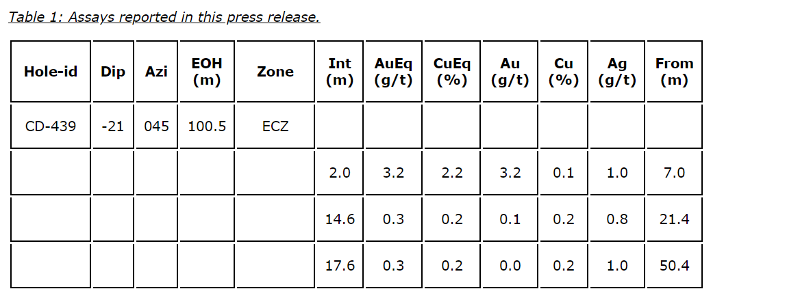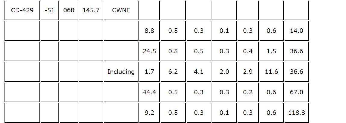- CD-429 (CWNE) -- 24.5 m at 0.8 g/t AuEq (0.3 g/t Au, 0.4 per cent Cu and 1.5 g/t Ag) from 36.6 m, including: