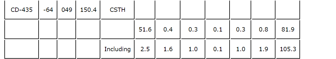 - CD-423 (CWNE) -- 39.3 m at 0.5 g/t AuEq from 78.4 m (0.1 g/t Au, 0.3 per cent Cu and 0.4 g/t Ag), including: