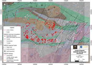 The property is underlain by volcanic rocks of the Obatogamau Formation cut by several stocks and plutons of intermediate composition. The volcanic rocks on the property are in contact with the Lichen pluton to the south in which pegmatites have been mapped. This geological environment is favorable to the presence of pegmatites both in volcanic rocks and in intrusive rocks.