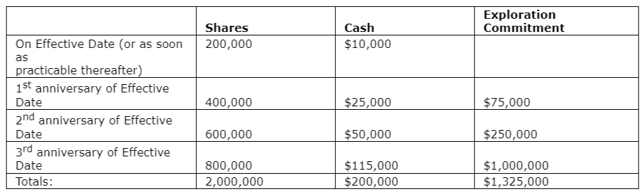 Lithium Lion can exercise its option to acquire a 100-per-cent interest in the project by completing the milestones on or before the dates indicated in the associated table.
