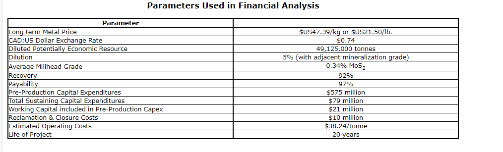 Pretax net present value (NPV) of $1.04-billion and internal rate of return (IRR) of 32 per cent and an after-tax NPV of $602-million and an IRR of 24 per cent at an 8-per-cent discount rate and assuming a long-term molybdenum price of $47.39 (U.S.) per kilogram or $21.50 (U.S.) per pound;