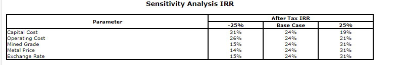 Sensitivity analyses were performed for capital expenditures, operating costs, mined grades, metal prices and currency exchange rates using 25-per-cent positive and negative variations. The project is most sensitive to the mined grade, metal price and the exchange rate and less sensitive to capital and operating costs. The results of the sensitivity analysis for positive and negative changes of 25 per cent in key project parameters are presented in the attached tables.