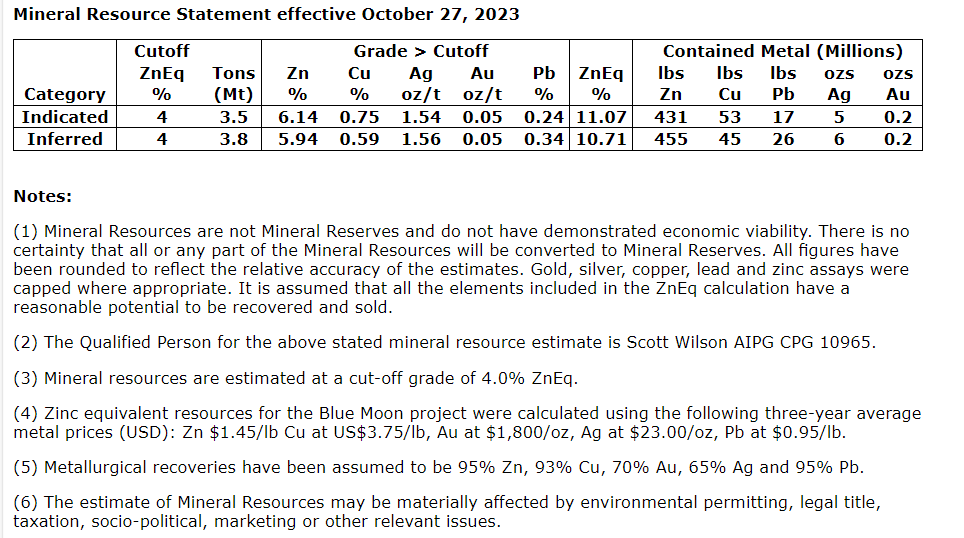 The updated mineral resource estimate provides us with a solid foundation to review the next stage of work, including a PEA for the project. In addition, we continue to have significant expansion and exploration opportunities at our Blue Moon project. The project enjoys the benefits of being located in the United States with the primary metal, zinc, being designated as a critical metal per the United States Geological Society."