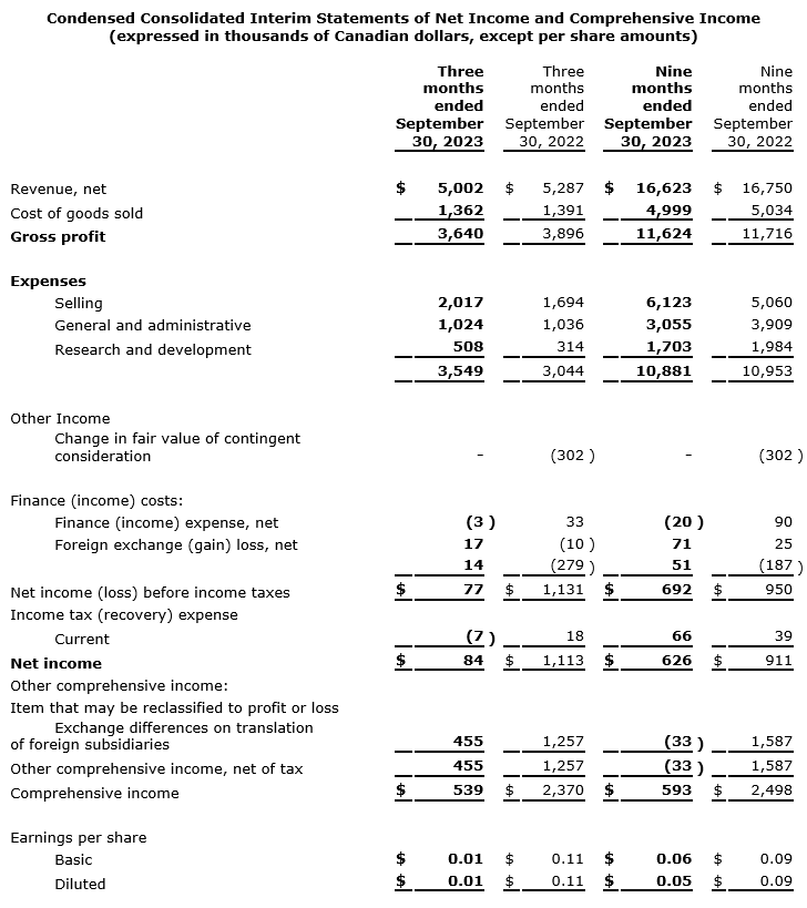 Net income for the quarter ended Sept. 30, 2023, was $84,000 or one cent per share compared with net income of $1.1-million or 11 cents per share for the quarter ended Sept. 30, 2022. The main factor contributing to the decrease in net income recorded for the quarter ended Sept. 30, 2023, was lower net revenue, higher selling and R&D expenses, partially offset by lower cost of goods sold during the current period.