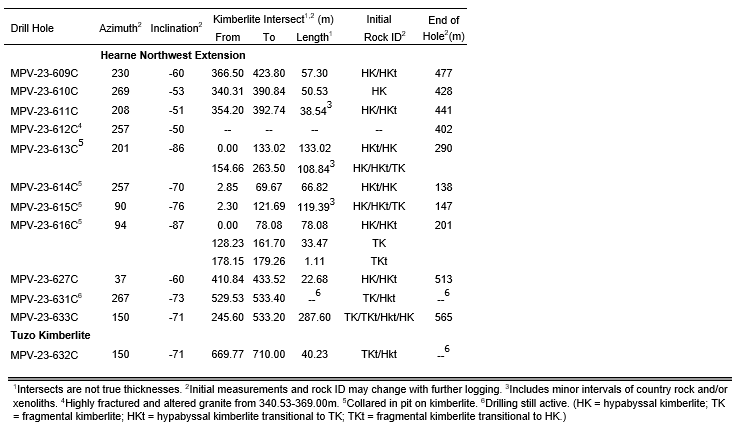 Drill hole MPV-23-632C intersected TKt/HKt kimberlite from 669.77 to 710.00 metres, and is located roughly 40 metres northeast of the Tuzo kimberlite. The kimberlite phase in Tuzo that is nearest to the intersect is modelled also as TKt. Logging and mineral chemistry of the drill core are under way to confirm whether it is similar in detail to Tuzo.