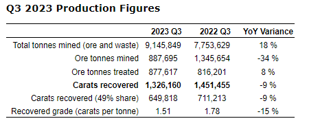 - 1,326,160 carats recovered, 9 per cent lower than the comparable quarter (Q3 2022: 1,451,455 carats);