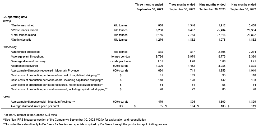 An attached table summarizes key operating statistics for the Gahcho Kue mine in the three and nine months ended Sept. 30, 2023, and Sept. 30, 2022.