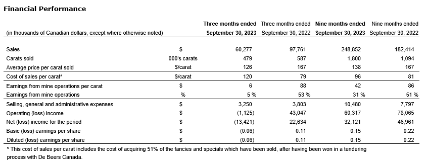 - Total sales revenue of $248.9-million ($184.9-million (U.S.)) for the nine months ended Sept. 30, 2023, at an average realized price of $138 per carat ($103 (U.S.)), compared with $292.5-million in 2022 ($226-million (U.S.)) at an average realized price of $154 per carat ($119 (U.S.));