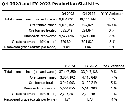 "Moving into 2024, the company faces a lower production year due to the effects of mine sequencing and grade profile changes, all normal occurrences in open pit diamond mining. This lower production year was anticipated, and the mine remains on track to achieve the previously stated 2024 production guidance of 4.2 million to 4.7 million carats at the JV level and 2.3 million to 2.6 million carats sold at the company level.