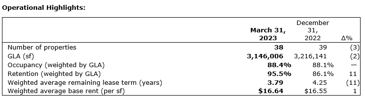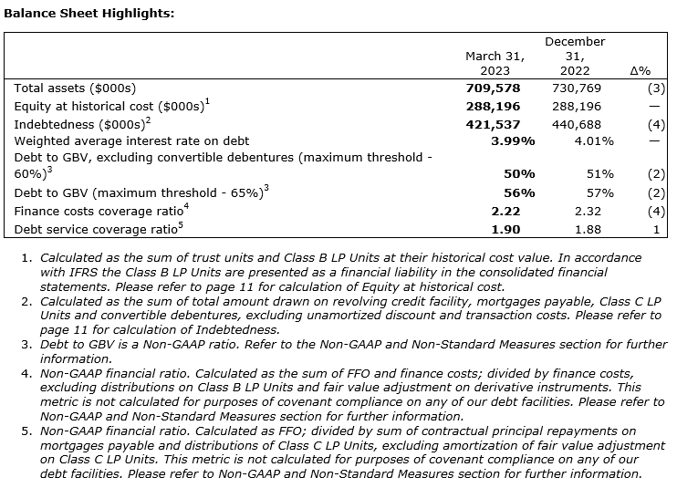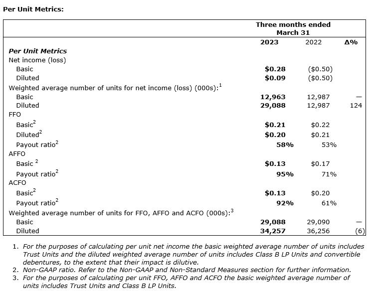 - Funds from operations (FFO) were down 8 per cent to $6.01-million or 21 cents per unit (Q1 2022: $6.53-million or 22 cents per unit);