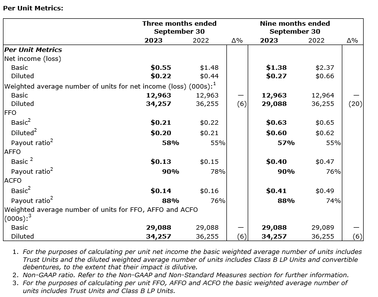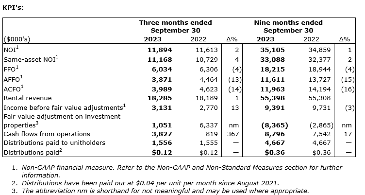 NOI, FFO, AFFO and ACFO are key measures of performance used by real estate operating companies; however, they are not defined by international financial reporting standards (IFRS), do not have standard meanings and may not be comparable with other industries or income trusts. These non-IFRS measures are defined and discussed in the REIT's MD&A for the quarter ended Sept. 30, 2023, which is available on SEDAR+.
