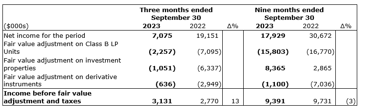 Income before fair value adjustment and income taxes is a non-GAAP financial measure and is calculated as net income excluding fair value adjustments for Class B LP units, investment properties and derivative instruments.
